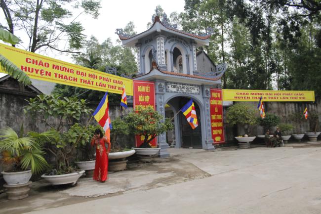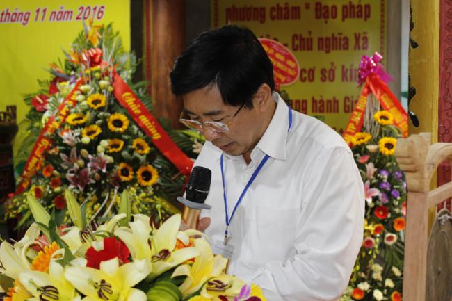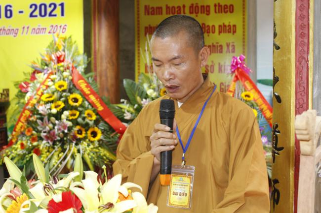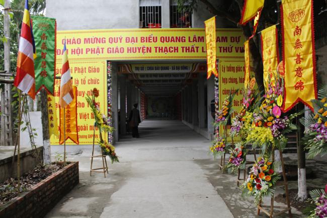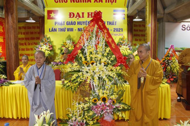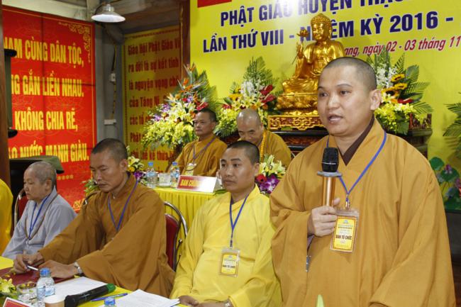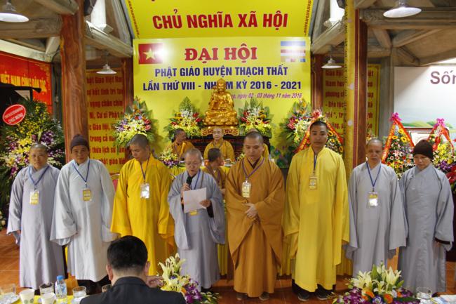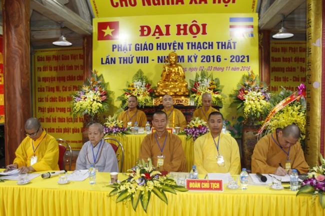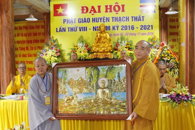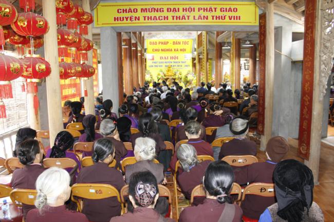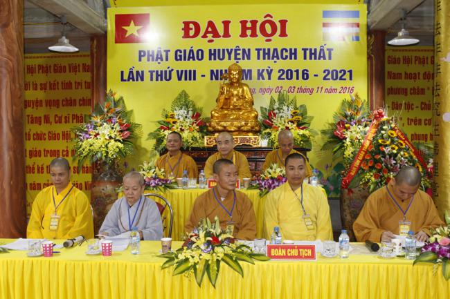 Tại đại hội, ông Kiều Hoàng Tuấn – Phó Chủ tịch UBND huyện Thạch Thất có vài lời phát biểu và tặng hoa chúc mừng. Trong lời phát biểu, ông hy vọng Phật giáo huyện Thạch Thất trong thời gian tới quan tâm hơn nữa đến việc tăng cường đoàn kết, hòa hợp, củng cố, mở rộng và trang nghiêm Phật pháp, thắt chặt mối quan hệ gắn bó giữa các thành viên, với Ban Trị sự Phật giáo ở các quận, huyện trong Thành hội góp phần giữ gìn, phát huy bản sắc văn hóa Phật giáo Việt Nam. Đó cũng là sự thể hiện tốt phương châm hoạt động “Đạo pháp – Dân tộc – Chủ nghĩa xã hội” và tinh thần “Phục vụ chúng sinh là cúng dàng chư Phật”.
