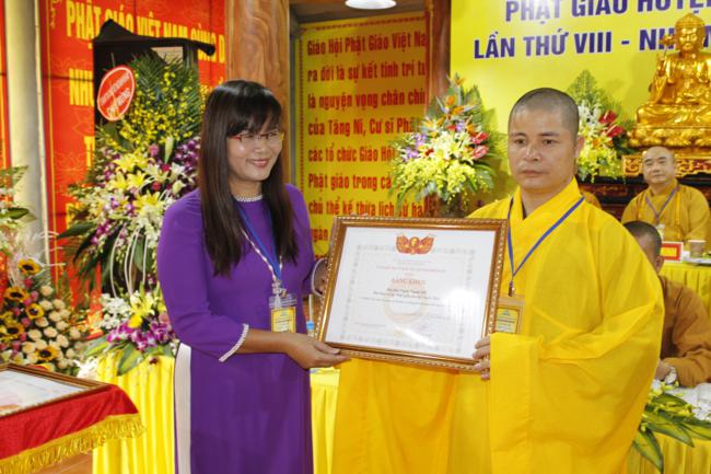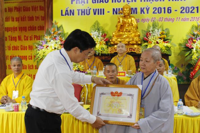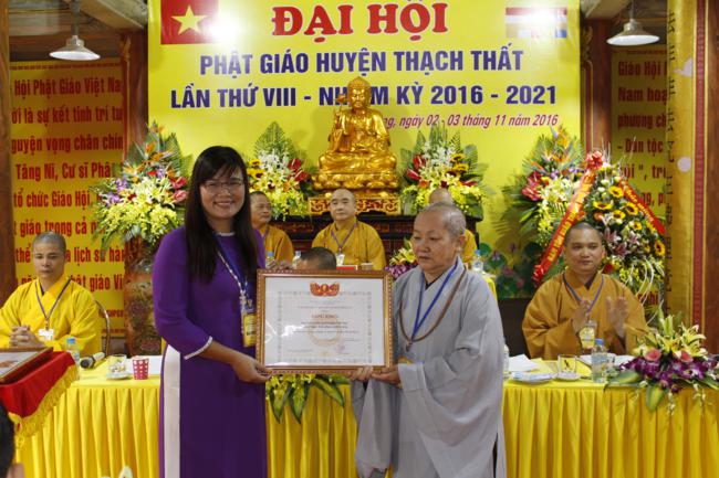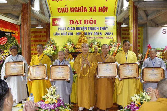 Tiếp theo, TT Thích Thanh Phúc đã thay mặt BTS GHPGVN thành phố Hà Nội trao bằng tuyên dương công đức cho những tập thể và cá nhân xuất sắc. Cũng nhân dịp này, các cá nhân và tập thể của BTS Phật giáo huyện Thạch Thất cũng đã đón nhận bằng khen của UBND – UBMTTQ huyện Thạch Thất trao tặng.