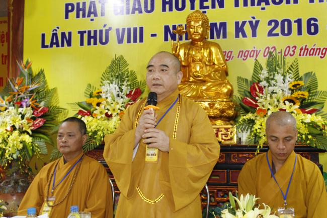 Cuối cùng, toàn thể đại hội đã được nghe lời đạo từ của TT. Thích Thanh Phúc, Thượng tọa hi vọng BTS GHPGVN huyện Thạch Thất sẽ hoàn thành mọi công tác Phật sự để góp phần xây dựng Phật giáo huyện nhà ngày một phát triển, góp phần xây dựng huyện ủy ngày một giàu đẹp văn minh, Tăng Ni Phật tử luôn phát huy thực hiện sứ mệnh thiêng liêng tứ chúng đồng tu, giúp Phật pháp ngày một xương minh. Thượng tọa đã ghi nhận sự đóng góp nhiệt tình của lãnh đạo huyện Thạch Thất trong nhiệm kì trước và cũng mong muốn lãnh đạo Huyện sẽ tạo điều kiện để Phật giáo huyện nhà sẽ hoàn thành tốt các công tác Phật sự trong nhiệm kì mới đúng theo phương châm “Phật giáo Việt Nam luôn đồng hành cùng dân tộc”.