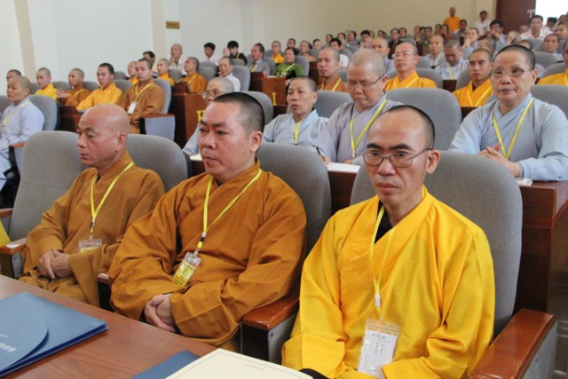 Đại hội đã nhất tâm lắng nghe lời đạo từ của Hòa thượng Thích Thanh Nhiễu thay mặt Ban thường trực HĐTS GHPGVN.