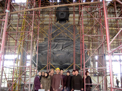 Đã thấy dáng dấp khung thô của ngôi Tiền Đại điện cao 30m, mặt sàn 1250m2, chồng diêm 3 tầng 12 mái, thờ tượng Đức Bản sư đúc bằng đồng liền khối nặng 105 tấn; ngôi Hậu Đại điện rộng 2450 m2, cao 38 m, cũng chồng diêm 3 tầng 12 mái, thờ ba pho Tam thế, mỗi pho đúc đồng liền khối, nặng 55 tấn.
