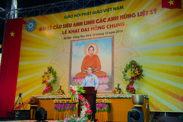“Đầu tiên, thay mặt Đảng, Nhà Nước, và thân nhân Anh hùng Liệt sĩ qua các thời kỳ gởi lời cảm ơn sâu sắc đến Trung ương GHPGVN, Tăng Ni Phật tử có mặt đã thành tâm tổ chức và tham dự cầu nguyện trong buổi lễ hôm nay. Để nhìn lại quá khứ mà thầm biết ơn những Anh hùng Liệt sĩ đã ngã xuống cho quê hương, cho đất nước có ngày hòa bình hôm nay. Tại đất Bà Rịa – Vũng Tàu này cũng là quê hương của người chiến sĩ trẻ năm xưa Võ Thị Sáu, người chiến sĩ đã lấy sự hy sinh của mình chống lại sự bạo tàn của thực dân Pháp, cũng như thể hiện tinh thần bất khuất của sự nghiệp giải phóng dân tộc trong mỗi chiến sĩ cách mạng, người dân Việt Nam.