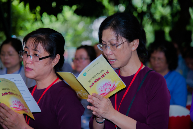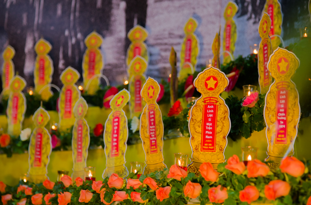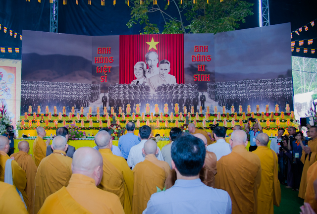 Trong không khí trang nghiêm, thanh tịnh, trầm hương quyện tỏa. Chư tôn Hòa thượng chứng minh đã thành kính bước lễ đài dâng hương tưởng niệm, chú nguyện bằng tiếng kinh siêu độ, một dạ chí thành, lắng lòng thanh tịnh, cầu nguyện anh linh các anh hùng chiến sĩ, đồng bào tử nạn đã hy sinh vì sự nghiệp giải phóng dân tộc, luôn được thảnh thơi trong cõi Tịnh.