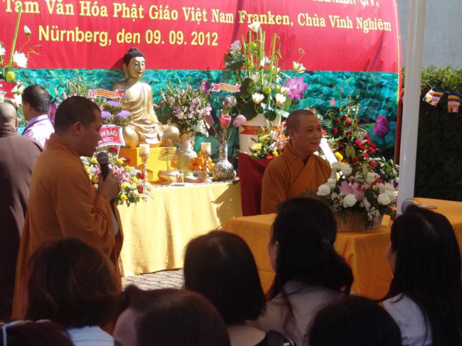 Trước khi cử hành Đại lễ cắt băng khánh thành chùa Vĩnh Nghiêm Tp. Nürnberg, gần 700 Phật tử thành kính và hân hoan đón nhận “cơn mưa pháp” vô cùng quý báu của Hòa thượng Thích Bảo Nghiêm về chủ đề “ngôi chùa với đời sống tâm linh người Việt”. Trong bài pháp thoại, Hòa Thượng nhấn mạnh về giá trị sâu sắc của ngôi chùa, đặc biệt là ngôi chùa Việt Nam: “chùa là nơi đáp ứng tâm linh cho người Việt, chùa vừa là trường học, vừa là bệnh viện, vừa là danh lam thắng cảnh để mọi người đến học tập, trị liệu và giải tỏa những nỗi khổ niềm đau trong cuộc sống”. Pháp âm trầm ấm đầy lòng từ bi, bằng những câu thơ, ca dao đầy tính nhân văn và triết lý pha chút nghệ thuật của Hòa Thượng đã khiến pháp hội đạo tràng lắng đọng trang nghiêm đôi lúc rộ lên những tràng vỗ tay thành kính.