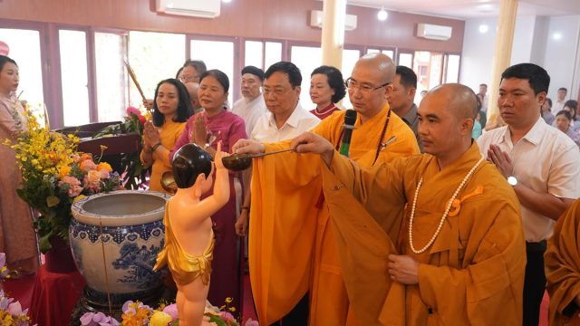 Khép lại buổi lễ, chư Tôn đức cùng toàn thể đại chúng đã trang nghiêm làm lễ niêm hương bạch Phật, tụng kệ Khánh Đản, thực hiện lễ tắm Phật – Đây là một pháp sự trọng yếu trong mùa Phật đản, mang ý nghĩa sâu xa – không chỉ là kỷ niệm ngày Đản sinh của Đức Từ Phụ, mà còn biểu trưng cho hành trình quay về nội tâm, thanh lọc những phiền não nhiễm ô và những tập tính xấu ác, từ đó quay lại với Phật tính vốn sẵn trong mình – thanh tịnh, sáng suốt và từ bi.