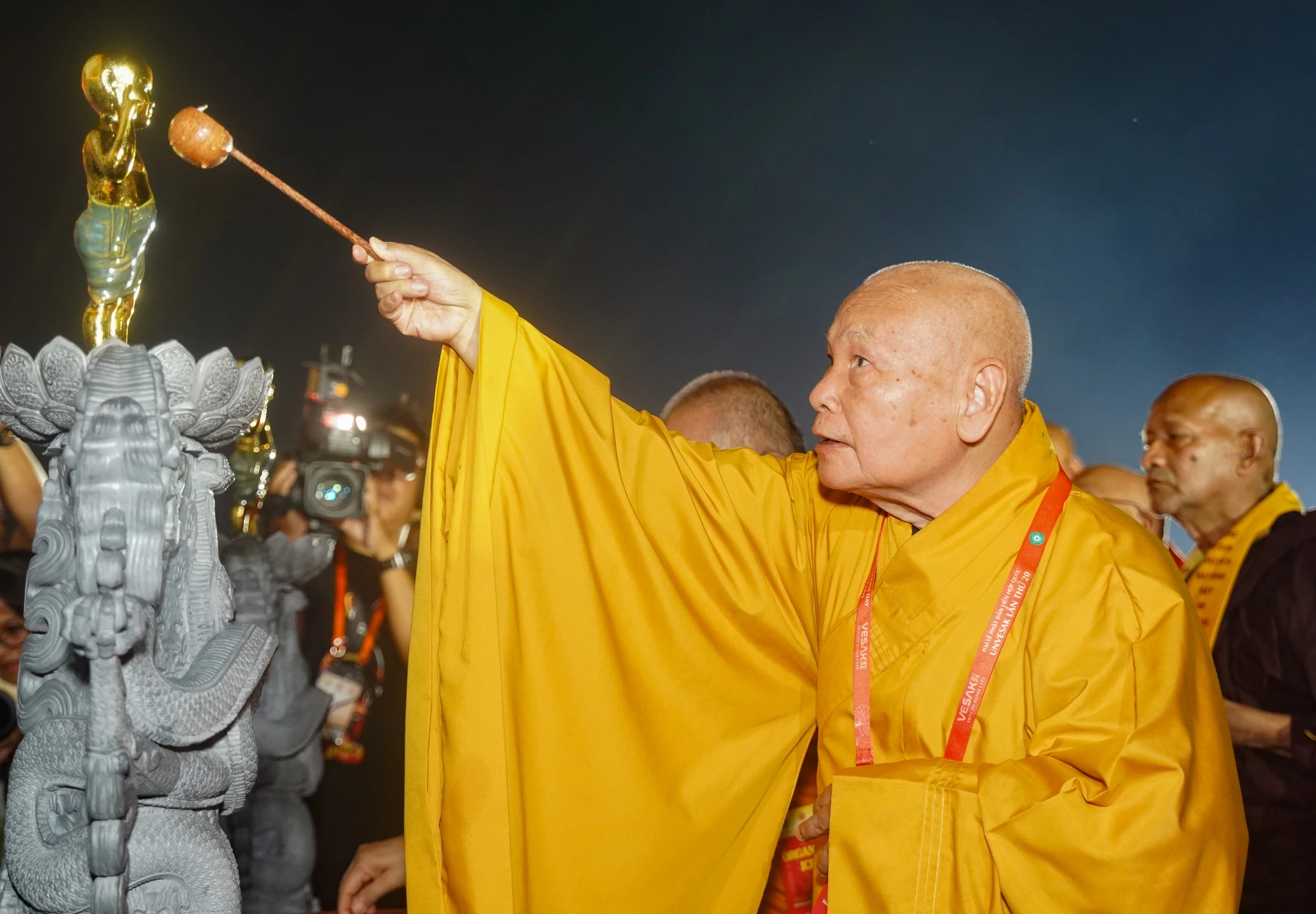 Hòa thượng Thích Thiện Nhơn, Phó Pháp chủ Hội đồng Chứng minh, Chủ tịch Hội đồng trị sự Giáo hội Phật giáo Việt Nam thực hiện nghi thức tắm Phật.