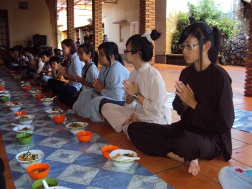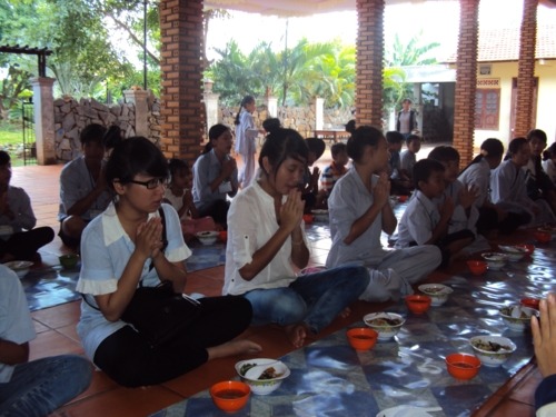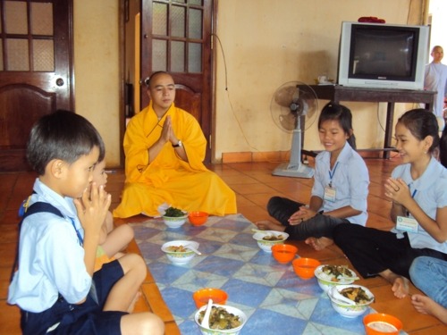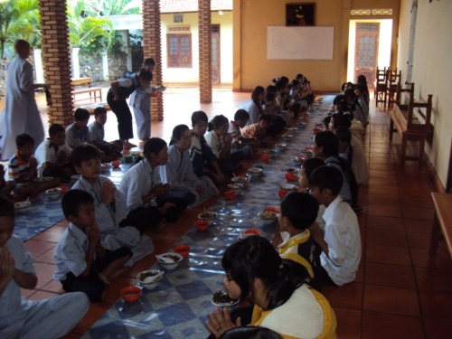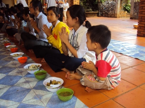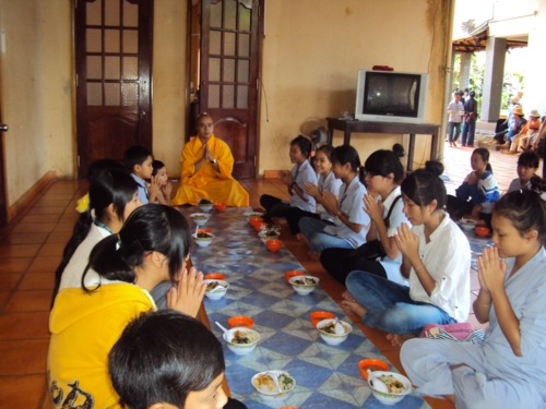 Phương pháp hướng dẫn cho các em giữ được chánh niệm trong bữa ăn trưa bằng cách niệm Phật liên tục từ lúc hành thiền trong chánh điện cho đến lúc ra nhận thức ăn tại bàn ăn. Cứ như thế , các em khoan thai, thong thả niệm Phật trong khi bưng thức ăn đi về nơi quy định. Khi đến chổ quy định các em vẫn niệm Phật và ngồi chờ các bạn đồng tu vào hết mới cùng tiến hành nghi thức thọ trai theo sự hướng dẫn của thầy trụ trì và các thầy cô học viện .