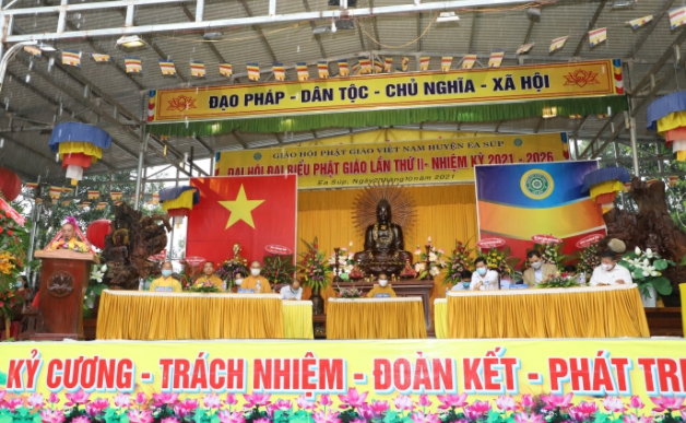 Sau phần phát biểu nhận nhiệm vụ và đọc phương hướng hoạt động nhiệm kỳ II 2021-2026 của Thường trực Ban Trị sự huyện EaSúp, Hòa thượng Thích Châu Quang – Trưởng Ban Trị sự PG tỉnh, chứng minh đại hội ban đạo từ: …”PGVN hiện nay đã thống nhất ý chí lãnh đạo theo Hiến chương GHPGVN. Hôm nay, Phật giáo huyện Tổ chức Đại Hội Đại biểu lần thứ II, nhiệm kỳ 2021 – 2026, để làm gạch nối cho Giáo Hội hướng dẫn Phật tử đi đúng với chánh Pháp của Đức Phật, đi đúng đường lối của Giáo Hội và tuân thủ Luật pháp hiện hành, xây dựng Tốt đời – Đẹp đạo, xây dựng Phật giáo địa phương ổn định – kế thừa và phát triển theo phương châm của GHPGVN Đạo pháp – Dân tộc –Xã hội chủ nghĩa,..”