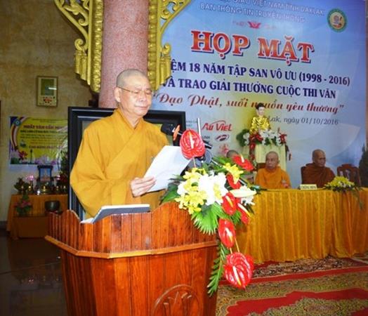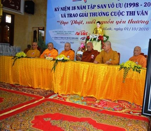 Sau phần nghi thức niệm hồng danh Đức Bổn sư Thích Ca Mâu Ni Phật, phút tưởng niệm và hoài niệm chư Thánh tử đạo, các cộng tác viên tiền bối, Cư sĩ Phan Bá Sĩ-Thư ký Ban Văn Hóa GHPGVN tỉnh Daklak điều phối chương trình, tuyên bố lý do, giới thiệu thành phần chứng minh và tham dự. TT.Thích Châu Quang-Trưởng BTS.GHPGVN tỉnh Daklak đọc diễn văn khai mạc nêu bật quá tỉnh hình thành và phát triển Tập san Vô Ưu trong 18 năm qua. Đặc biệt Daklak là một tỉnh miền núi Tây Nguyên đại ngàn có 44 dân tộc anh em sinh sống, Vô Ưu ra đời đáp ứng nhu cầu giao lưu văn hóa Phật giáo với các dân tộc anh em, là một tập san Phật giáo ra đời sơm nhất chỉ sau Báo Giác Ngộ.