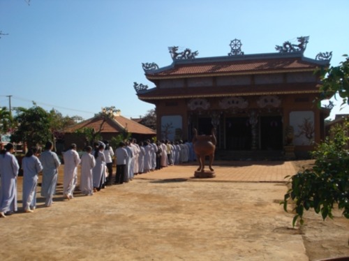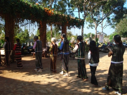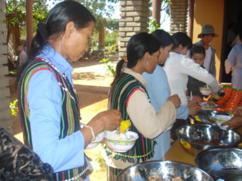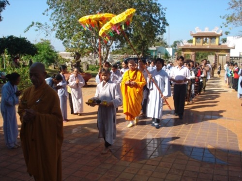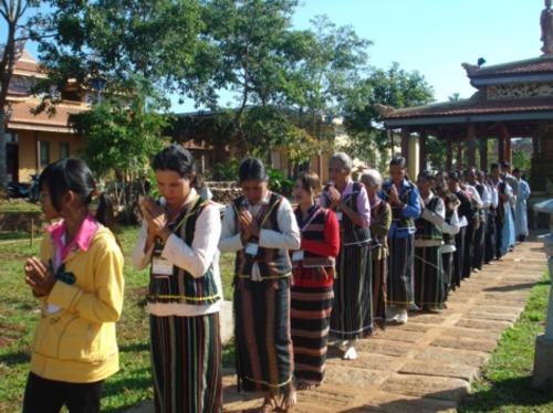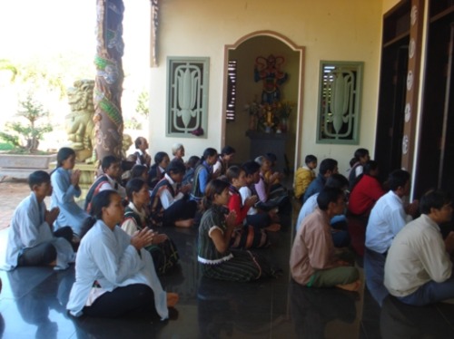 Theo thông lệ vào những ngày giáp tết là phải lo tưới nước cho cây cà phê. Bởi vậy lo càng thêm lo.Nhưng rồi mọi người cũng phải tạm thời " quẳng " cái lo qua một bên, để cùng hướng tâm về chùa Hoa Nghiêm tham dự khoá tu một ngày an lạc cuối cùng trong năm 2009. Sáng nay người đồng bào dân tộc về chùa đông hơn mọi khoá tu trước. Họ đi từng nhóm , từng nhóm từ các buôn làng xa cách chùa vài chục cây số. Chắc họ dậy từ sớm lắm nên giờ mới hơn bảy giờ đã có mặt tại chùa.