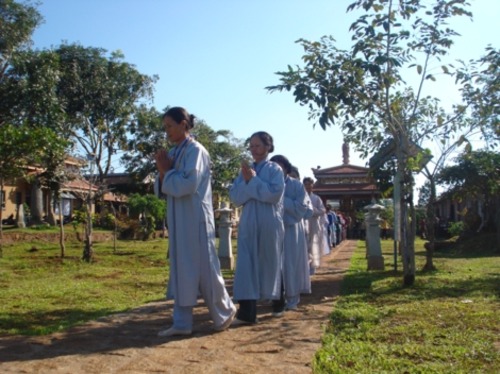 Dòng người khoan thai từng bước chân hành thiền an lạc. Người kinh và người đồng bào xen kẻ vào nhau cùng hướng về bảo điện ADiĐà . Tiếng niệm hồng danh Đức Phật vang lên trong buổi sáng cuối năm nghe linh thiêng, ấm áp đến lạ thường .