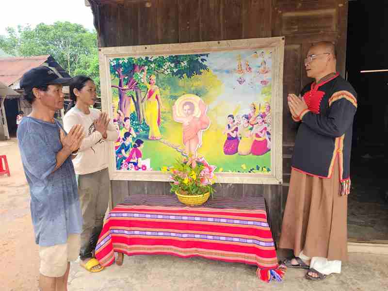 Chư tôn đức phát tâm tặng hình tượng Đản Sinh cho 12 điểm sinh hoạt Phật giáo và hướng dẫn bà con thiết lập vườn Lâm Tỳ Ni trang trí Phật đản tại các tư gia trong buôn làng.