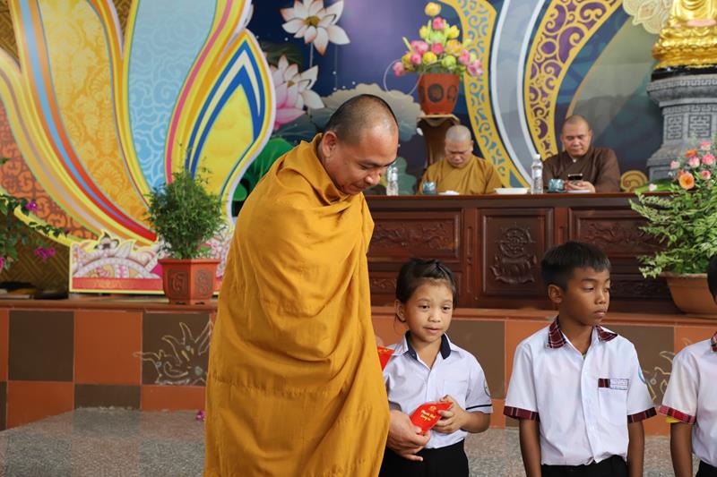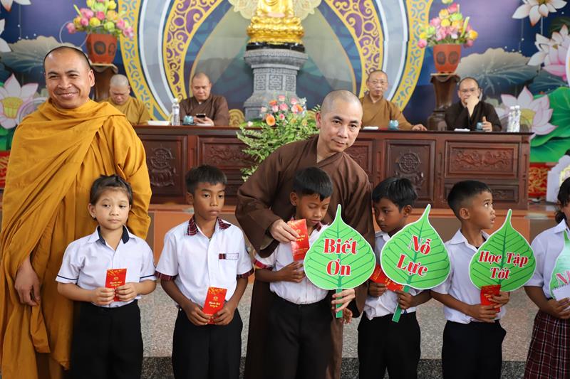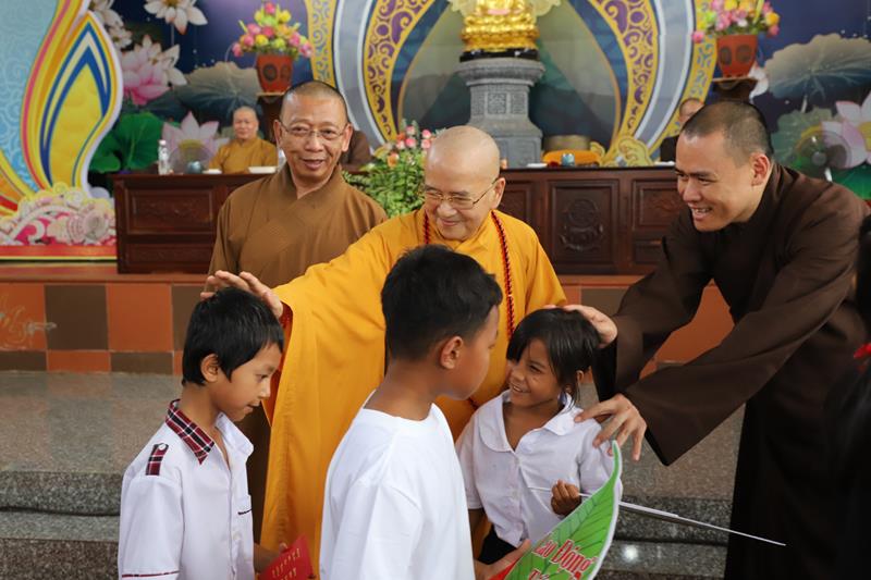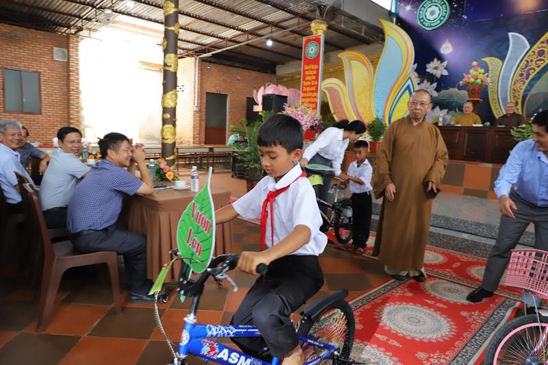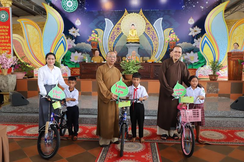 Chư tôn đức trao quà tặng xe đạp đến các em học sinh có hoàn cảnh khó khăn nhằm tiếp bước em đến trường