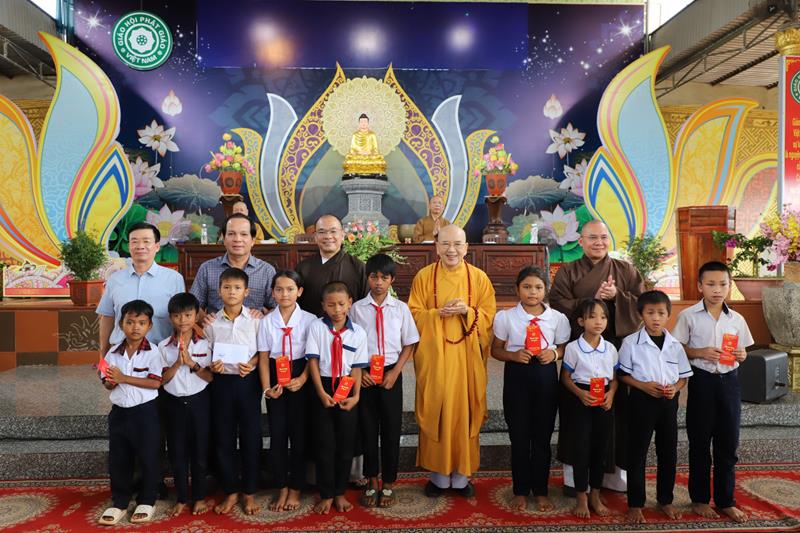 Nhân dịp này chư tôn đức Ban HDPT TƯ, Phân ban PTDT TƯ cùng các cấp lãnh đạo chính quyền địa phương huyện Huyện CưM’gar trao tặng 43 suất học bổng tiếp theo dự án tiếp bướp Em đến trường của chùa Hoa Nghiêm và trao tặng 5 chiếc xe đạp tới các em học sinh khó khăn tại chùa Hoa Nghiêm huyện Cư M’gar, trao tặng 15 chiếc xe đạp tại chùa Quảng Trạch huyện Lăk nhằm tiếp sức các Em hiếu học có hoàn cảnh khó khăn đến trường trên địa bàn tỉnh Đăk Lăk.