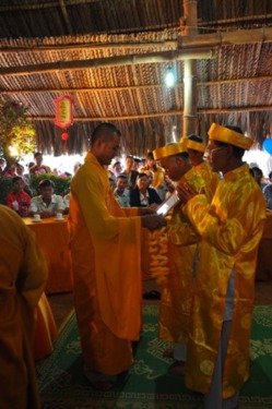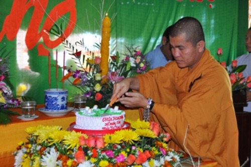 Tại buổi lễ ĐĐ. Thích Quảng Hiền thắp nến cầu nguyện, cắt bánh và trao quà mừng thọ cho các cụ Phật tử từ 65 đến 95 tuổi.