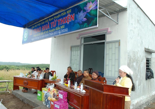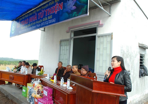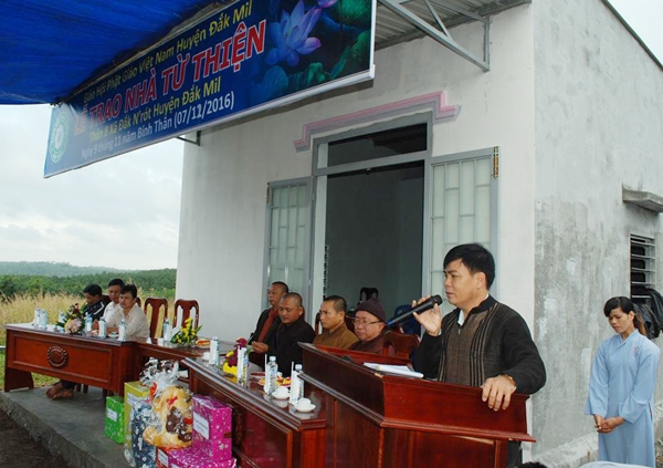Tại buổi lễ, Thượng tọa chứng minh và ĐĐ.Thích Nhuận Thân đã có lời thăm hỏi đến gia đình. Sau đó, ông Nguyễn Ngọc Hậu phát biểu chúc mừng gia đình anh Hoàng Minh Long và gửi lời cảm ơn đến BTS Phật giáo huyện, cũng như Hội Từ thiện cơm chay Hướng Thiện chùa Hoa Nghiêm và các nhà hảo tâm đã cùng chung tay xây dựng ngôi Nhà Tình thương, cũng như những phần quà đến gia đình anh Hoàng Minh Long.