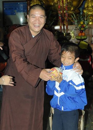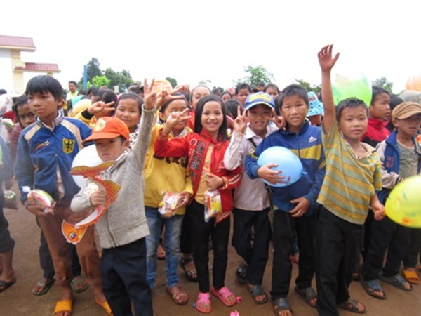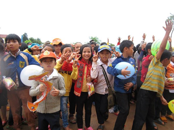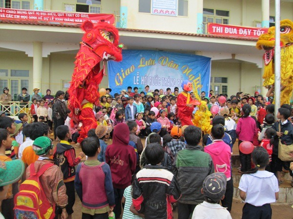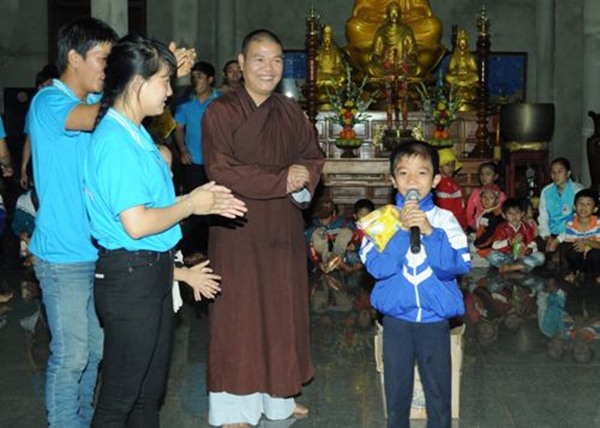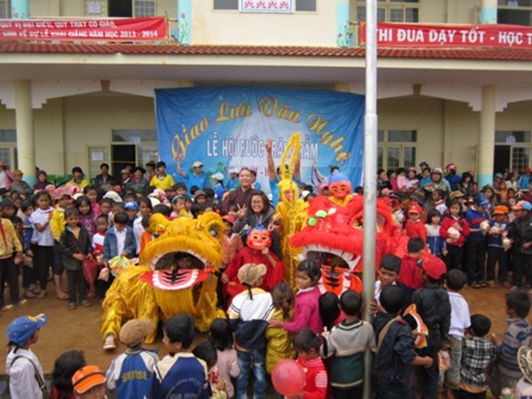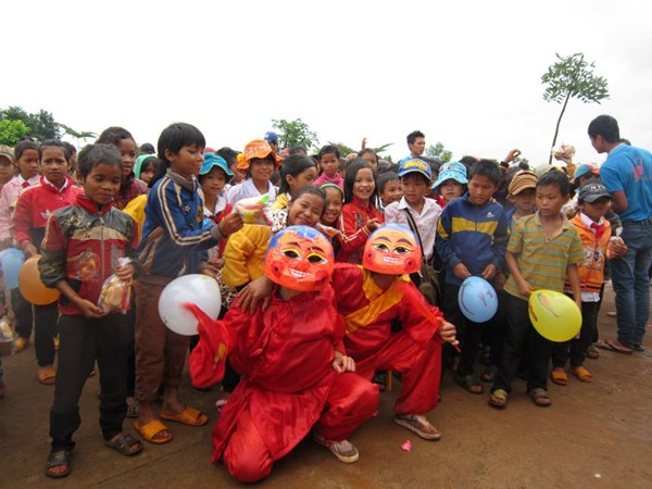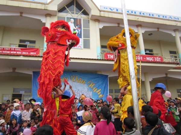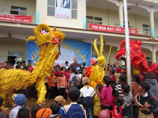 Không khí tại trường rất vui, mặc dù thời tiết mưa. Nhưng các em nhỏ đã tập trung đầy đủ và rất háo hức xem tiết mục múa lân. Tại đây, Đại Đức trụ trì thay mặt cho các nhà hảo tâm tại Tp Hồ Chí Minh gửi tới cho các em 500 phần quà bánh kẹo, trường mẫu giáo mầm non Hướng Dương 230 phần bánh kẹo