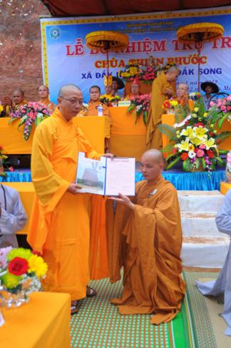 TT. Thích Quảng Tuấn thay mặt BTS PG tỉnh nhà đã trao giấy quyết định bổ nhiệm trụ trì cho Đại đức tân trụ trì.