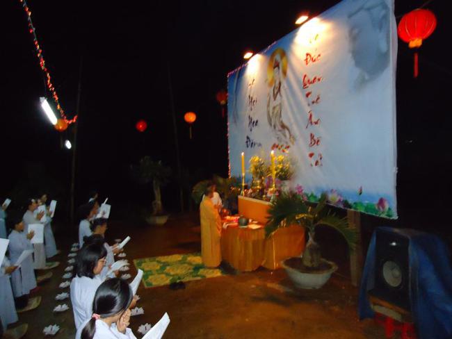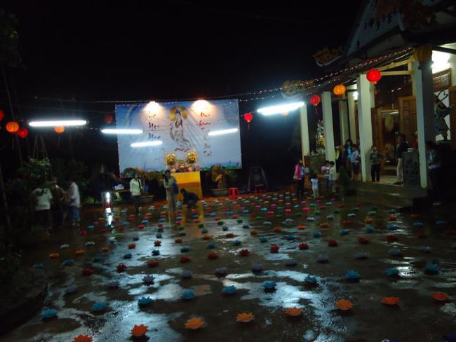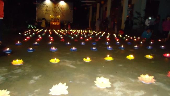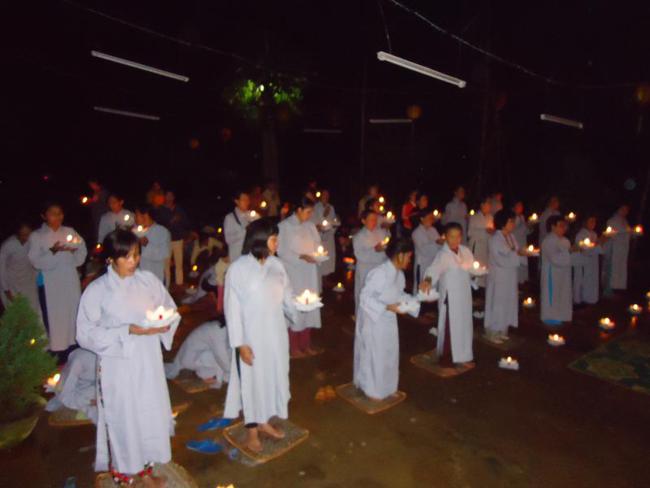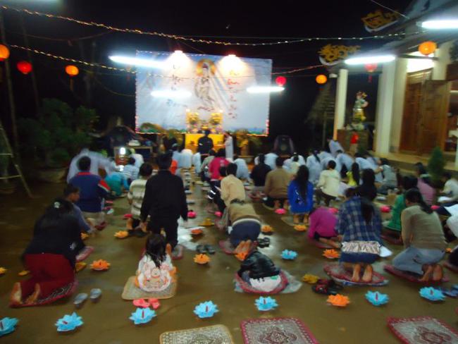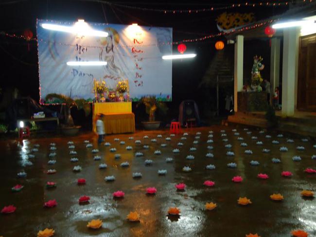 Thời tiết ở đây vào mùa mưa, đường lên chùa còn nhiều khó khăn lầy lội, nhưng quý Phật tử cùng nhau vân tập về chùa từ lúc 16 giờ chiều để chuẩn bị thiết trí sắp nến, lễ chính thức vào 19h 30 tối.