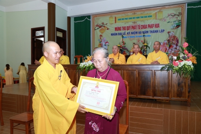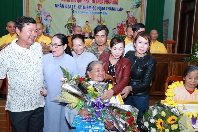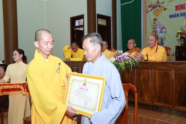 Sau buổi triển lãm, Thầy trụ trì tiếp tục tổ chức buổi lễ mừng thọ cho gần 50 Phật tử lão niên của ngôi chùa. Nhân dịp này, Chư Tăng trao giấy chúc mừng thọ, những vòng hoa tươi thắm, chúc các cụ sống lâu hơn nữa để làm trụ cột cho cháu con. Làm người hướng dẫn con cháu biết hướng về Tam Bảo, tu nhân tích đức.