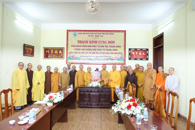 Đón tiếp phái đoàn có TT.Thích Quảng Hiền – Ủy viên HĐTS, Trưởng BTS PG tỉnh Đắk Nông; TT.Thích Nhuận Thân – Phó BTS, Trưởng ban Hoằng pháp PG tỉnh; TT.Thích Chiếu Ý – Phó BTS, Trưởng Ban HDPT kiêm Trưởng ban Từ thiện xã hội PG tỉnh; ĐĐ.Thích Quảng Tráng – Chánh Thư ký BTS PG tỉnh; TT.Thích Giác Nhường – Phó Thư ký, Chánh Văn phòng BTS PG tỉnh; ĐĐ.Thích Vạn Hiển – Phó Thư ký BTS PG tỉnh cùng sự tham dự của chư Tôn đức Thường trực BTS PG tỉnh.