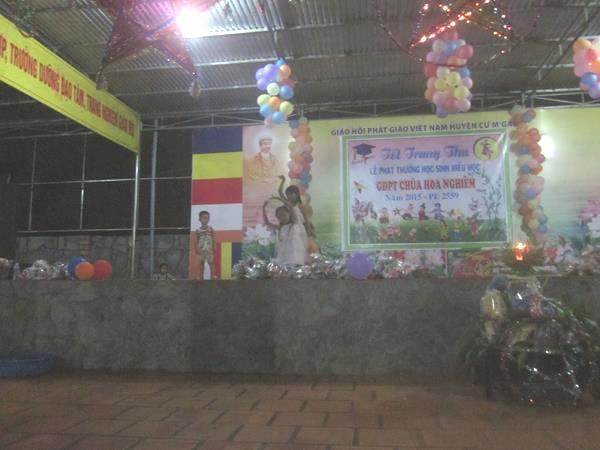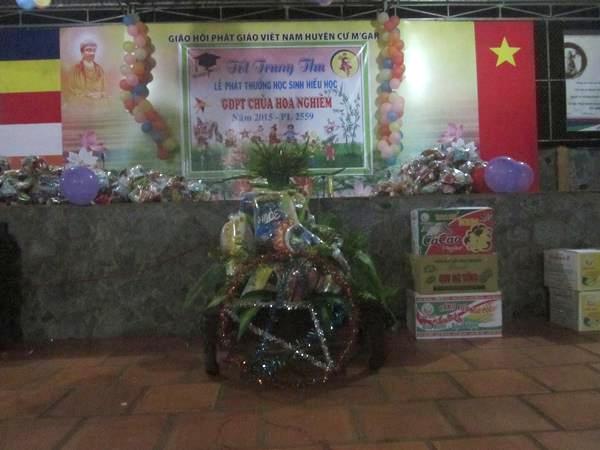 Chiều 15/8/Ất Mùi, Đại Đức trụ trì đã đến chung vui và chia sẻ 100 phần quà Trung thu cho các cháu thiếu nhi xã EaTar. 19h cùng ngày, tại bổn tự Hoa Nghiêm cũng đã tổ chức Đêm Hội Trăng Rằm và phát thưởng, liên hoan văn nghệ và múa lân cho 600 em có thành tích học tập cao trong năm học 2014 – 2015, chương trình đã tạo được nét sinh hoạt mang đậm bản sắc văn hóa truyền thống của dân tộc .