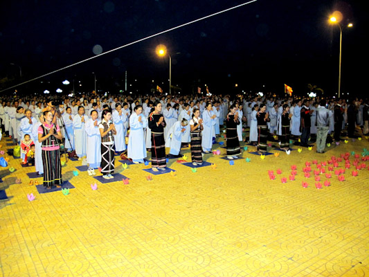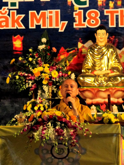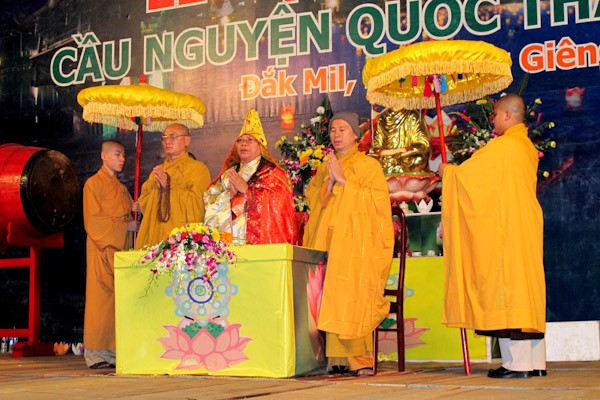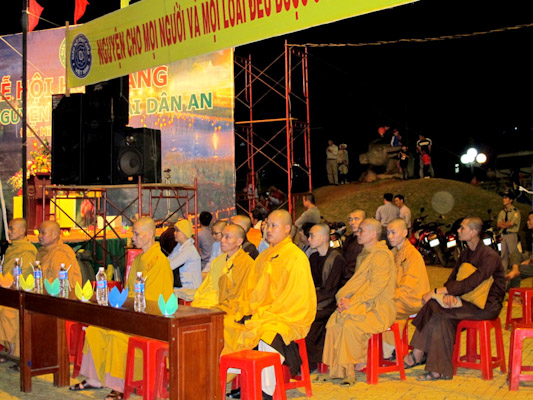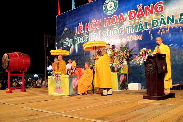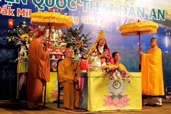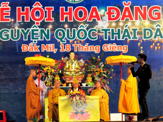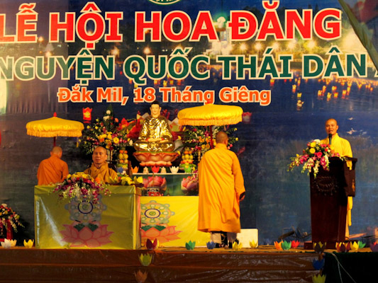 Lời đạo từ của HT.Thích Quảng Xả – UV thường trực HĐTSTW GHPGVN thật sâu sắc. Hoà thượng tán dương công đức của BTS PG tỉnh Đăknông cùng Ban Đại Diện Phật giáo Huyện Đăkmil, nhất là TT.Thích Quảng Tuấn (Trưởng BTC Lễ hội) đã phối hợp với các Ban ngành địa phương tổ chức được một Lễ hội Hoa đăng rất ý nghĩa và trang trọng hơn những năm trước. Hoà thượng hy vọng mọi điều tốt đẹp sẽ đến với mọi người trong năm mới. Trên tinh thần của buổi Lễ, Hoà thương nêu bật ý nghĩa Lễ Hội hoa đăng là đem ánh sáng từ bi trí tuệ của Đức Phật đã ban rãi để mọi người biết làm lành, biết tu thiện và biết hướng về chánh pháp, hầu đem lại sự lợi lạc cho đất nước nói chung và cho huyện nhà nói riêng. Ngoài ra, Lễ Hội hoa đăng còn là cầu nguyện cho tất cả các vị anh hùng dân tộc, đồng bào tử nạn ở đây được trượng thừa ánh sáng hào quang của Chư Phật, ra khỏi chổ tối tăm, trờ về cảnh giới an lạc.