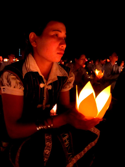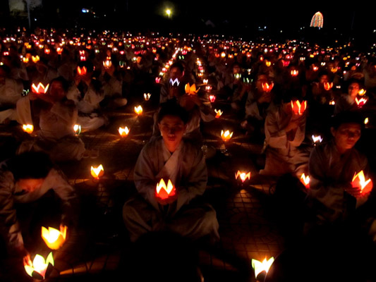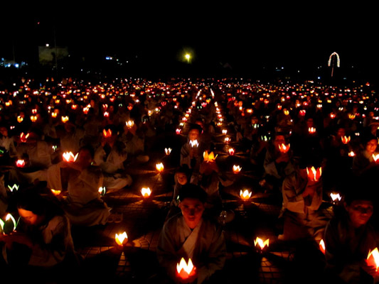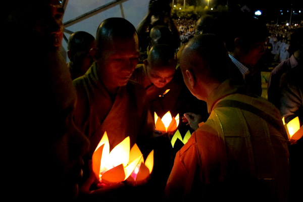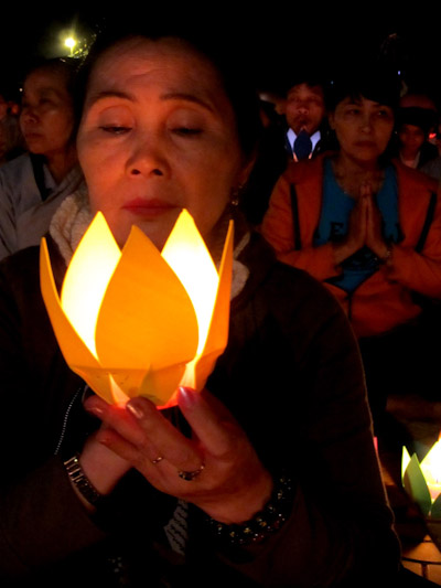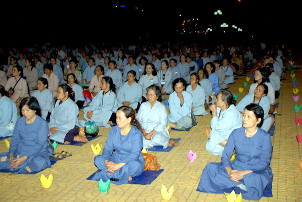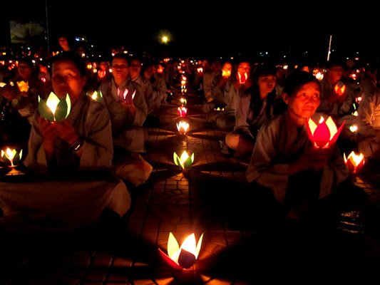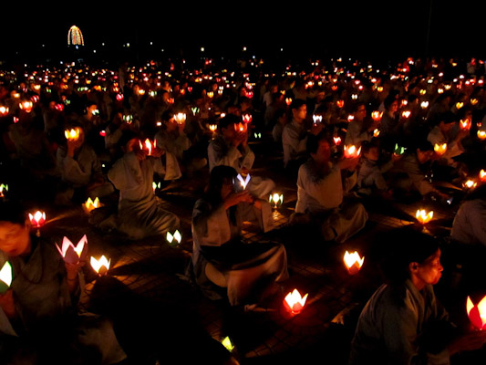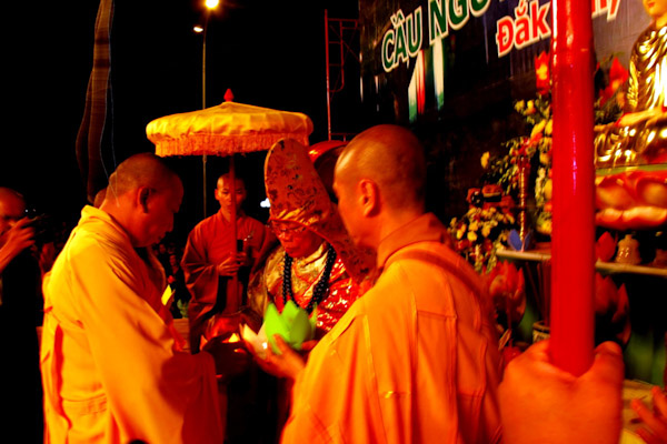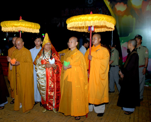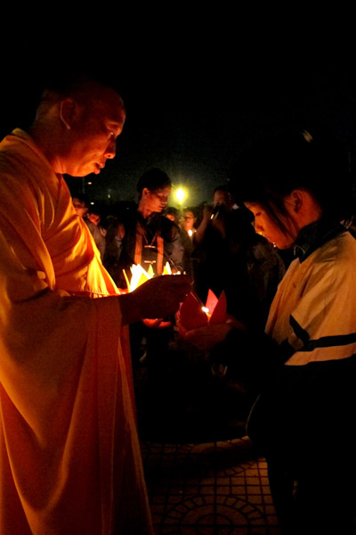 Liền đó, nghi thức truyền đăng – Cầu nối sự truyền thông giữa Phật và chúng sanh. Trong giờ phút thiêng liêng, ánh sáng từ bi, ánh sáng trí tuệ của Mười phương Chư Phật được trao truyền từ Hoà thượng chứng minh đến Chư tôn đức hiện tại, đến các cấp Lãnh đạo chính quyền và tất cả Hội chúng. Những ngọn nến được thắp lên, tỏa mình trong đêm tối, đã tạo thành một khung cảnh lung linh và huyền ảo. Tiếp theo, hàng vạn hoa đăng được thả xuống hồ Tây trong sự nhất tâm cầu nguyện cho đạo Pháp được trường tồn, đất nước thanh bình, nhân dân an lạc.