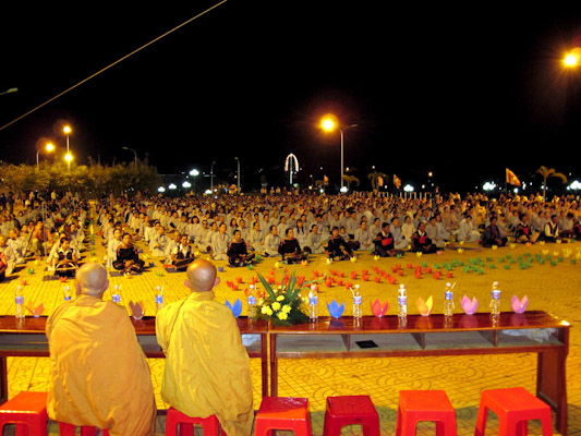 Còn trên bình diện một quốc gia, vài ngàn con người ngồi đây mở một tấm lòng cầu nguyện thay cho 80 triệu con người của quốc gia này bằng cách “Hứa”. Chính cái Lễ đàn này là một lời hứa vĩ đại tận tấm lòng, cả hết cuộc đời của ta. Nói là Lễ cầu, sự thật không phải “Cầu” mà là một lời hứa để đạt được ước mơ Quốc thái dân an. Đây là lời hứa với Trời Phật bằng tất cả tâm huyết, cả cuộc đời của mình thì chúng ta mới thay đổi được Trời đất, mới làm cảm động được bao nhiêu tầng Trời ở trên, để chúng ta đạt được ước mơ là Quốc thái dân an.
