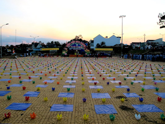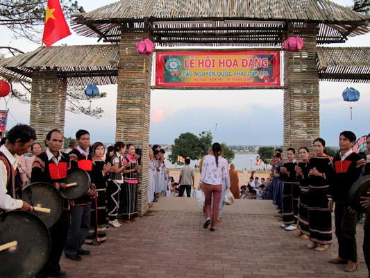 Bắt đầu 16h00”, dòng người càng lúc càng đông, đổ dồn về chật kín khu vực hồ nằm giữa trung tâm thị trấn vốn thường tĩnh lặng, giờ thì càng trở nên sống động bởi âm thanh, những bước chân tới lui, tiếng cười nói chào hỏi của Phật tử râm ran. Đặt chân vào hoa viên Hồ Tây, giữa rừng người mà ai cũng có vẻ thân thiện, cho ta cảm nhận đâu đây hương thơm hoa cà phê hoà quyện với hương vị của lòng người Đăkmil sao rất đổi mến thương.