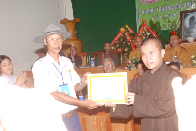 Hội nghị cũng vui mừng đón nhận bằng tán dương công đức do Đại đức Thích Quảng Hiền thay mặt ban Trị sự trao cho tập thể ban Hướng dẫn Phân ban GĐPT tỉnh và cá nhân anh Thị Vân-Lê Văn Tuyển.