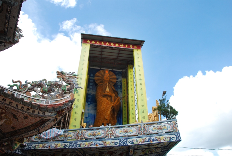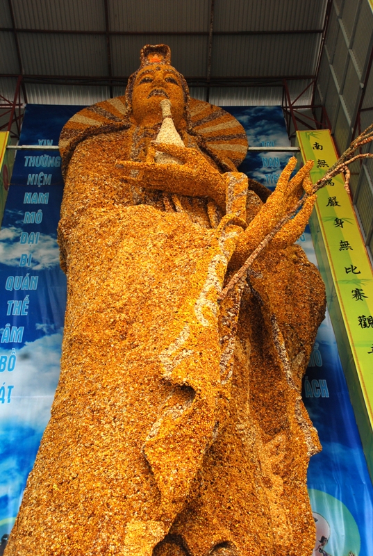 Được biết bảo tượng Quán Thế Âm Bồ Tát được kết bằng 650.000 đóa hoa Bất tử ( một loài hoa đặc trưng của TP Đà Lạt ), do 30 nghệ nhân và 600 Phật tử chế tác trong 36 ngày có chiều cao 17m, nặng khoảng 3 tấn .