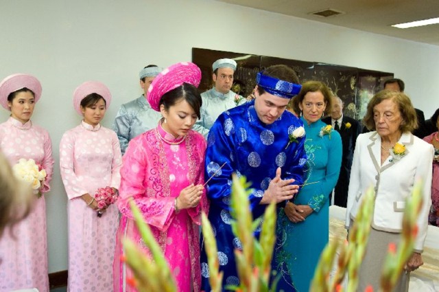 Buổi lễ được cử hành trang nghiêm và hài hòa giữa hai nền văn hóa Việt – Mỹ. Các nghi thức lễ lạy ông bà và dâng trà lên đấng sinh thành đều được cử hành tại chùa trong không khí vui tươi, hiểu biết và trân trọng. Đặc biệt, trong trang phục áo dài truyền thống, cô dâu và chú rễ đã giới thiệu đến người bản xứ một nét đẹp của văn hóa Việt Nam.