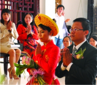 Bên cạnh ông bà, tổ tiên, quyết thuộc hai học, bạn hữu… Đức Phật và chư Tăng ni đã có mặt trong lễ cưới của họ, chứng minh ước nguyện thành gia thất của họ. Lễ cưới thêm phần giá trị tâm linh, thiêng liêng, còn không khí nhà chùa thêm phần sinh động.