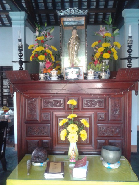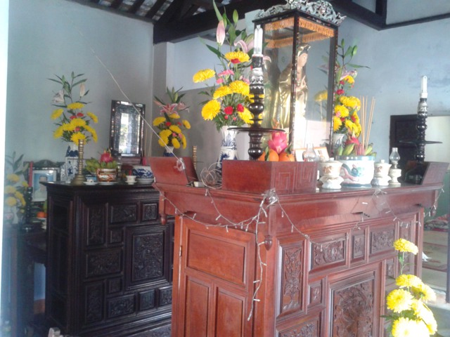 Gia đình gia chủ thờ gia tiên, ông bà ở phía sau. Phía trước thờ Phật Bà Quan Âm. Vậy là tất cả cùng ngồi trước bàn thờ Phật Bà để tụng kinh, niệm Phât và làm các nghi lễ. Người lớn và trẻ con, già và trẻ cùng đều tụng kinh.