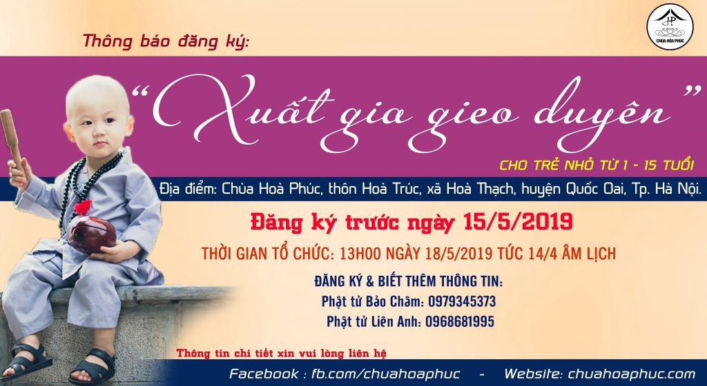 Nhân kỷ niệm 2643 năm ngày Thái tử Tất Đạt Đa ra đời và cùng chào đón Đại lễ Vesak Liên hiệp quốc năm 2019 được tổ chức lần 3 tại Việt Nam, CHÙA HOÀ PHÚC (xã Hoà Thạch, huyện Quốc Oai, Tp, Hà Nội) long trọng tổ chức LỄ “XUẤT GIA GIEO DUYÊN” dành cho các bạn nhỏ từ 1-15 tuổi.