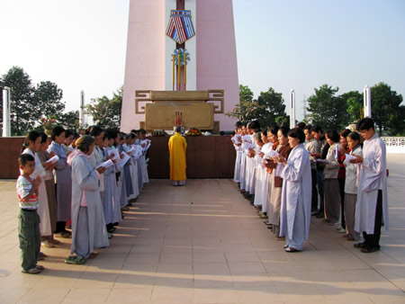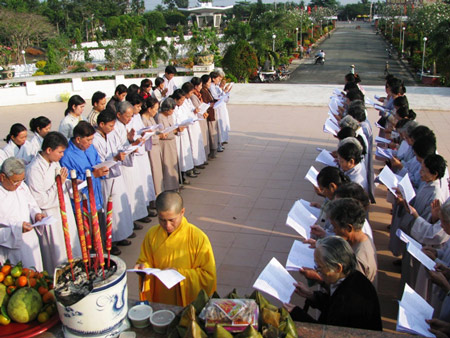 Sau khi thiết lễ phẩm vật cúng linh, ĐĐ Thích Minh Bảo hướng dẫn các phật tử tiến hành nghi thức tụng niệm. Bằng tất cả tâm thành của người con Phật, hòa quyện với khói nhang trong tiếng kinh cầu trầm lắng, bổng chốc cả khuôn viên rộng lớn của nghĩa trang trở nên ấp áp lạ thường trước việc làm rất nhỏ của tín đồ Phật giáo.