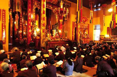 Có một điều cũng cần phải nói đến trong các hoạt động sinh hoạt tôn giáo điển hình của Phật tử Việt Nam đó là việc lên chùa tụng kinh niệm Phật cầu cho quốc thái dân an, gia đình hòa thuận, chúng sinh an lạc vào những ngày rằm và mồng một hàng tháng. Vào những ngày này, tại hầu hết các ngôi chùa trong cả nước, đông đảo bà con Phật tử từ già trẻ, gái trai đều lên chùa thành kính tụng kinh niệm Phật. Tại chùa Quán Sứ, một ngôi chùa lớn ở Thủ đô và cũng là nơi đặt trụ sở của Trung ương Giáo Hội Phật giáo Việt Nam, vào những ngày này người ta lại thấy đông đảo bà con Phật tử khắp nơi tụ hội về thành kính trang nghiêm