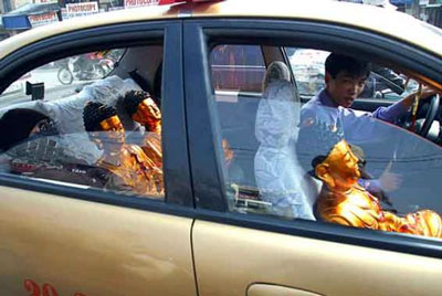 Trong khi ở nông thôn người nông dân đến với Phật bằng những món quà quê đơn sơ mà hồn hậu thì ở những nơi thành thị người ta lại có cái cách riêng của mình để thể hiện lòng thành trước Phật. Ví dụ như người Phật tử trong bức ảnh này đã cất công lặn lội về tận một làng nghề truyền thống để đặt làm những bức tượng Phật sơn son thếp vàng rồi thành kính chuyển lên chùa để dâng cúng cho kịp ngày khánh thành ngôi chính điện.