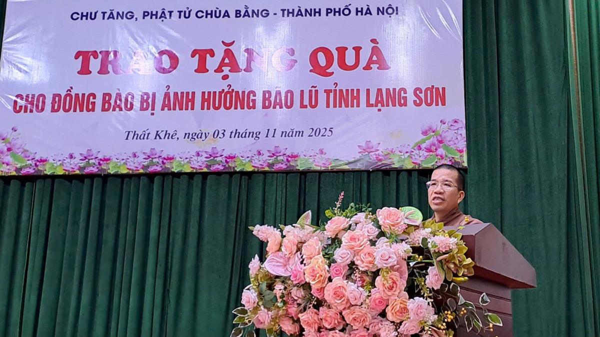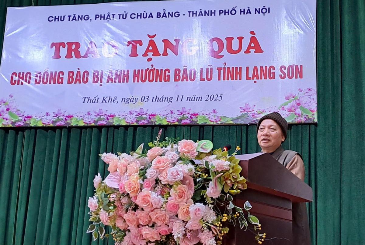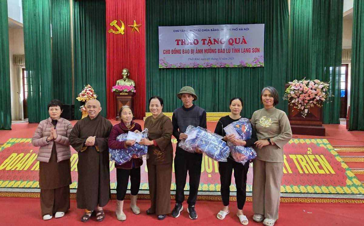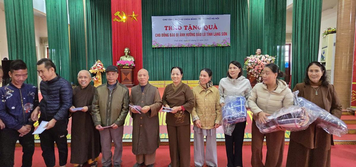 Vâng theo sự chỉ dạy của Hòa thượng Ân sư Thích Bảo Nghiêm – Phó chủ tịch HĐTS, Trưởng Ban Hoằng pháp TƯ GHPGVN, ngày 3/11, dưới sự hỗ trợ của BTS GHPGVN tỉnh Lạng Sơn, Thượng tọa Thích Chiếu Tuệ – Ủy viên HĐTS, Phó Trưởng Ban Thường trực Ban Hoằng pháp TW và Thượng tọa Thích Tâm Thuần – Phó Ban Hoằng pháp TW đã dẫn đoàn Phật tử Đạo tràng Pháp Hoa chùa Bằng tới trao tặng những phần quà ý nghĩa với tổng trị giá hơn 200 triệu đồng đến bà con vùng lũ xã Thất Khê nơi đây.