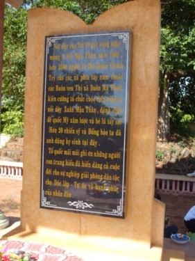 “ Nơi đây vào lúc 3 giờ sáng ngày mồng 02 Tết Mậu Thân năm 1968, hơn 2500 người là đội quân chính trị của các xã phía tây nam thuộc các buôn ven thị xã Buôn Ma Thuột kiên cường tổ chức cuộc tiến công và nổi dậy Xuân Mậu Thân, đánh đuổi đế quốc Mỹ xâm lược và bè lũ tay sai. Hơn 20 chiến sỹ và đồng bào ta đã anh dũng hy sinh tại nơi đây. Tổ quốc mãi mãi ghi ơn những người con trung hiếu đã hiến dâng cả cuộc đời cho sự nghiệp giải phóng dân tộc, cho độc lập – tự do – hạnh phúc của nhân dân ”