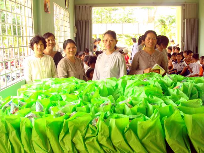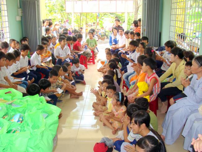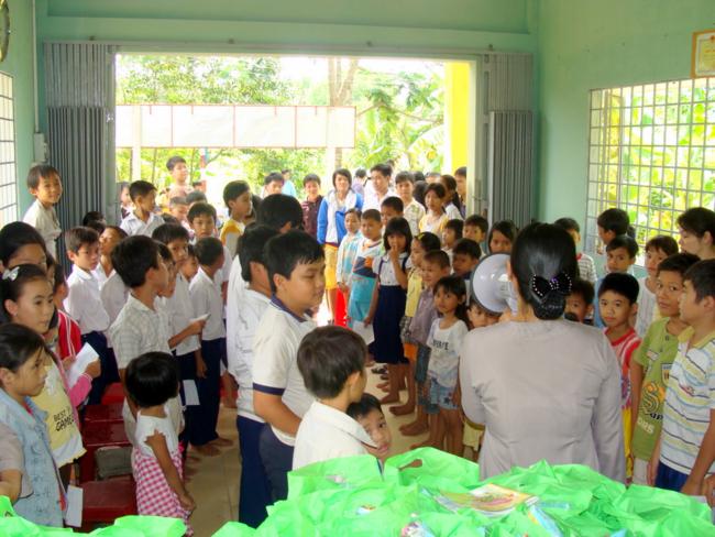 Được sự hợp tác, hỗ trợ từ phía Chính quyền và các Giáo viên địa phương, buổi trao quà diễn ra thuận lợi. Mỗi em nhận được một phần quà gồm: 10 – 15 quyển tập, 02 cây viết, bánh kẹo, trị giá trên 70.000 đồng, do các Phật tử hảo tâm đóng góp.