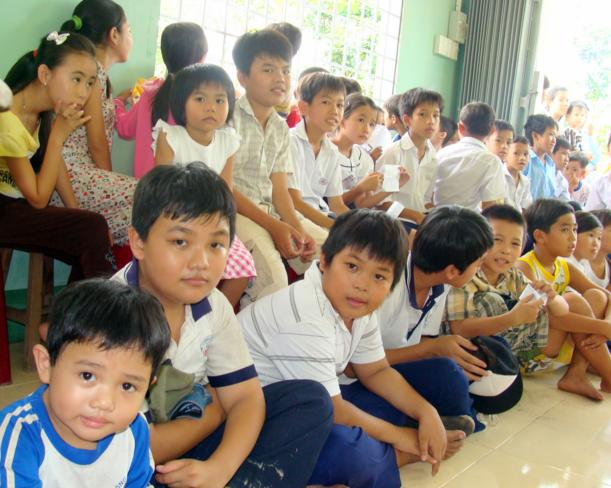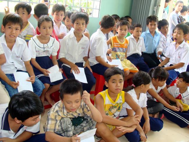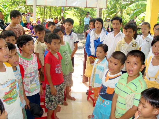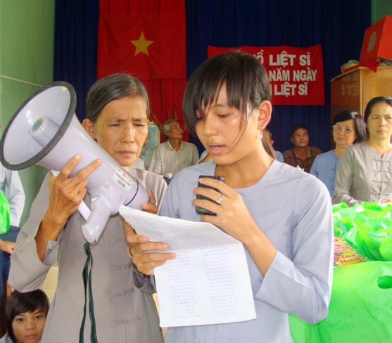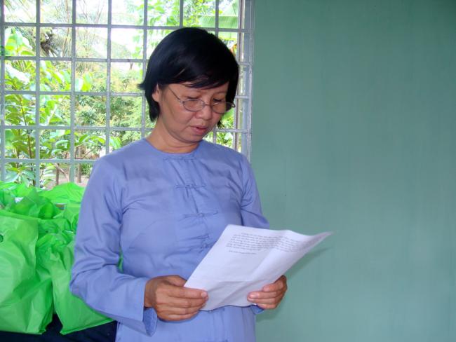 Tiếp theo, em Nguyễn Ngọc Bích Tuyền đại diện cho các bạn học sinh nói lời cảm tạ và hứa sẽ cố gắng học hành, siêng làm việc thiện, rèn luyện đạo đức để trở thành người hữu ích cho xã hội, cho làng xã mình, bởi vì “Ấp Đồng – quê hương chúng con – hộ nghèo và khó khăn vẫn còn rất nhiều”.