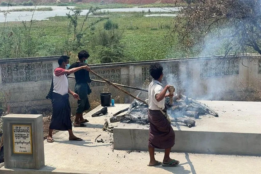 Thi thể một nhà sư thiệt mạng do trận động đất được hỏa thiêu tại đài hỏa táng ở Mandalay.