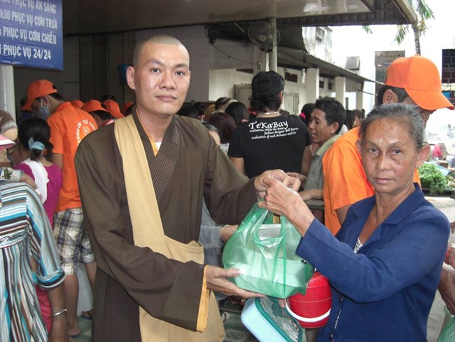 Vào một ngày chủ nhật, chúng tôi theo chân thầy cùng với những Phật tử chùa đến Bệnh viện Đa khoa tỉnh Bình Dương. Như đã quen thuộc, thân nhân người bệnh các khoa nhiễm, khoa tâm thần, khoa nhi, khoa nội tay cầm bát, cầm ca đón đợi sẵn. Một cụ già nhận hộp cơm tỏ lòng biết ơn.