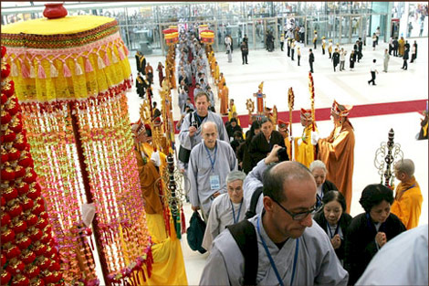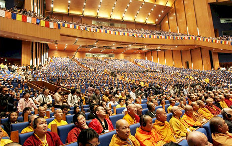 Ở bên Trung Quốc chỉ để bàn thờ Phật lúc đầu, trong lễ khai mạc có tụng niệm, sau đó thì hạ màn xuống. Ban đầu giống như một chính điện Phật vậy, trang nghiêm hoành tráng lắm, sau đó thì họ hạ rèm hội thảo xuống, Phật khuất phía sau, còn phía trước không còn thấy Phật nữa, đó là một phong cách khác thôi.