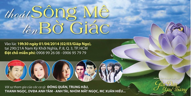 Ngoài ra, quý khán thính giả sẽ được thưởng thức nhiều ca khúc Phật giáo hay và ý nghĩa khác. Để tham dự đêm nhạc này, quý vị chỉ cần đăng ký trực tiếp tại nhà hàng Việt Chay (290/21A Nam Kỳ Khởi Nghĩa, Q.3) hoặc qua số điện thoại 0908 992 608 – 0906 95 79 79.
