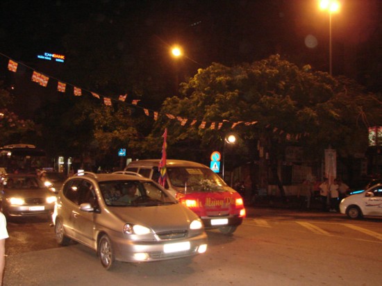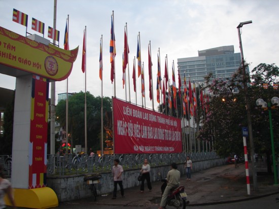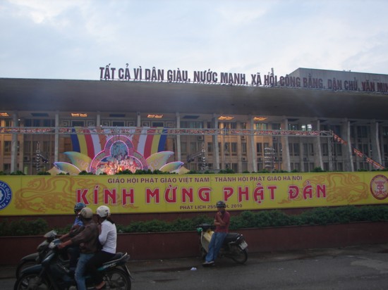 Chập tối nay, trục đường Quán Sứ đã được trang hoàng băng rôn, cờ, phướn…, sinh hoạt dân sự vẫn bình thường. Nhưng sớm mai để dành riêng cho đại lễ hội, đại lộ này sẽ cấm lưu thông. Đây là năm thứ 2 Đại lễ hội Phật đản được Nhà nước chính thức cho phép tổ chức ngoài trời tại quảng trường 1 – 5 lịch sử – văn hóa. Đây là một vinh dự riêng có của PG.