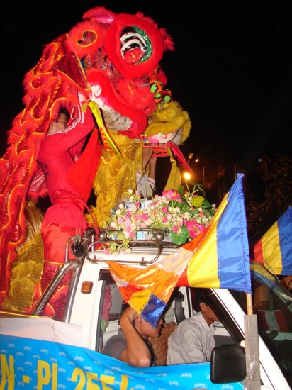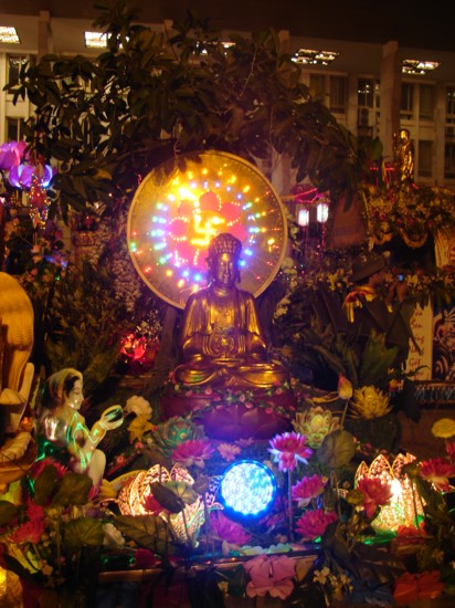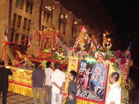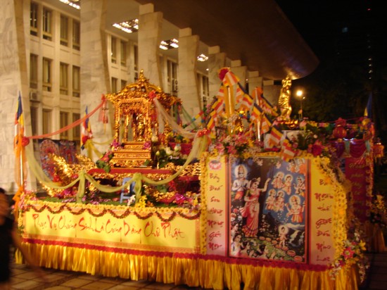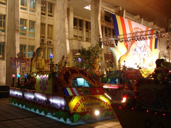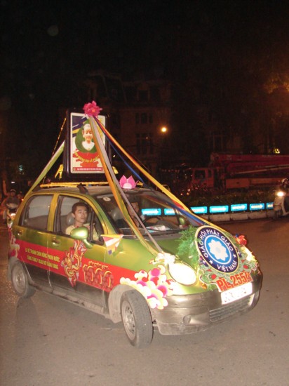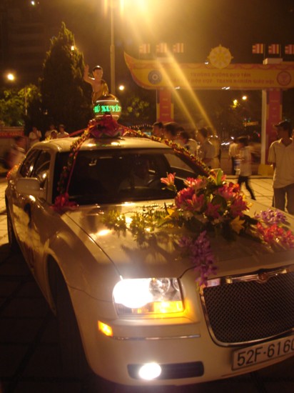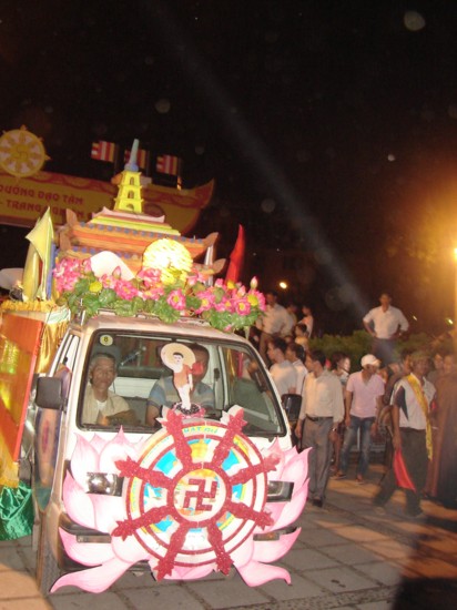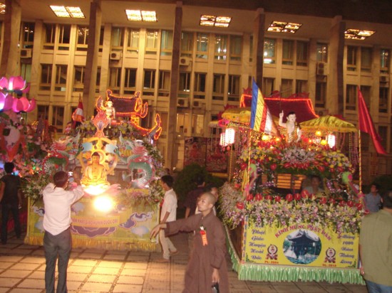 Rất nhiều Phật tử từ xa cũng trang trí ô tô, xe máy với cờ, hoa, biểu tượng Phật đản. Nhiều người sẽ ngủ đêm hôm nay tại khu vực quảng trường này để dự Đại lễ Phật đản ngày mai.