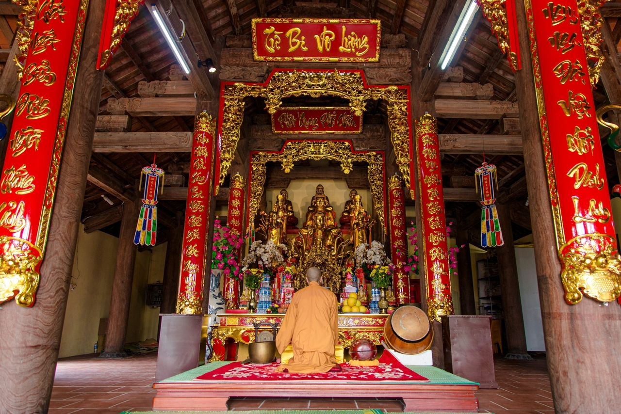 Toà Tam Bảo – chùa chính được xây dựng vững chãi với diện tích mặt sàn 270m2. Chùa có kiến trúc theo lối truyền thống của đồng bằng Bắc Bộ, mái cong, ngói hài, tường bao miết mạch, không chát, tạo nên sự giản dị gần gũi với người chiêm bái, du khách. Phần mộc đục tỉ mỉ với hoa văn họa tiết trang trí rồng phượng.